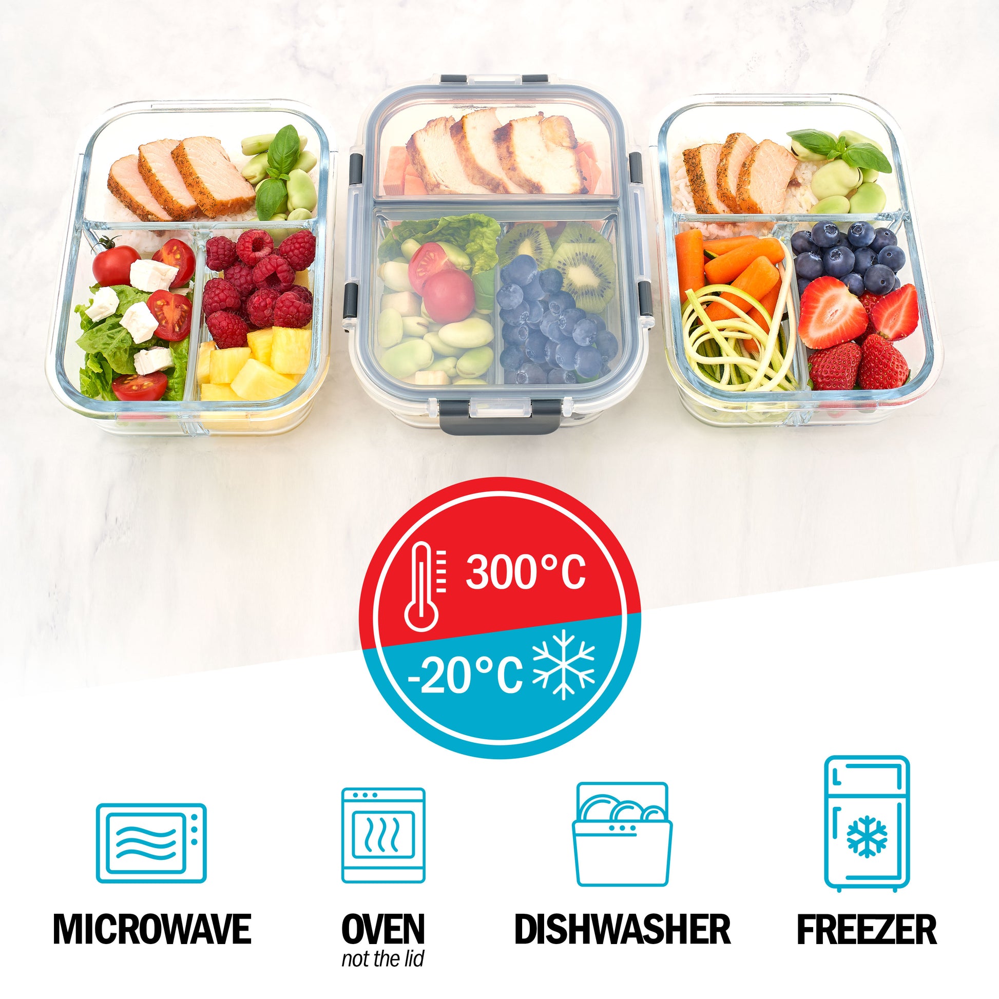 - With divided chambers, our 2 and 3 compartment glass containers feature areas to keep food separate